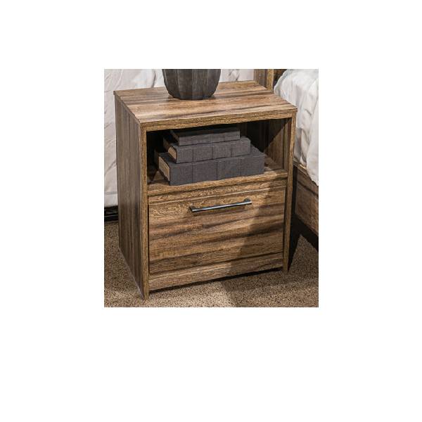 The Elbrim One Drawer Night Stand offers a contemporary touch with its sleek and textured finish.Its compact design fits effortlessly into modern spaces while offering convenient bedside storage.Crafted for durability, this piece blends practicality with modern elegance.