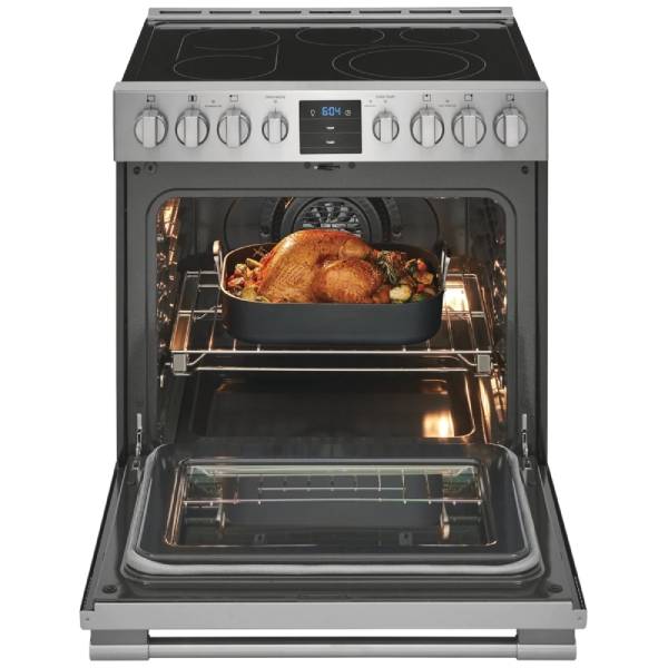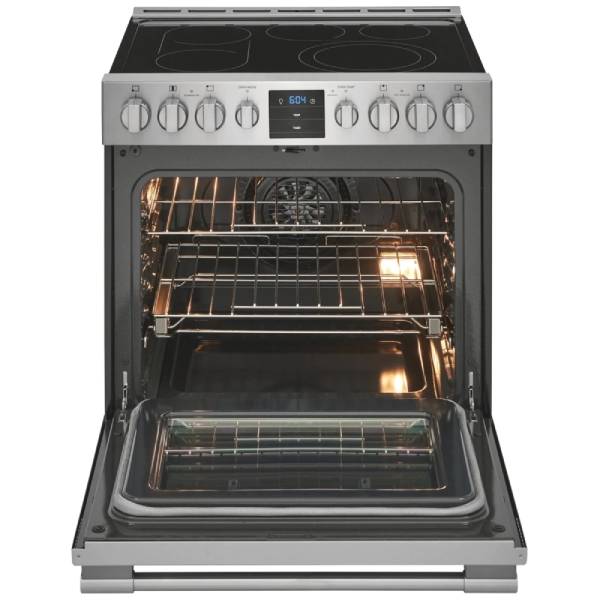 Frigidaire Professional PCFE307CAF Electric Range, Electric, 30 inch Exterior Width, Self Clean, Convection, 5 Burners, 5.4 cu. ft. Capacity, Storage Drawer, Air Fry, 1 Ovens, Stainless Steel colour Air Fry tray included, Telescopic Gliding Extension Rack, True European Convection, Temperature Probe