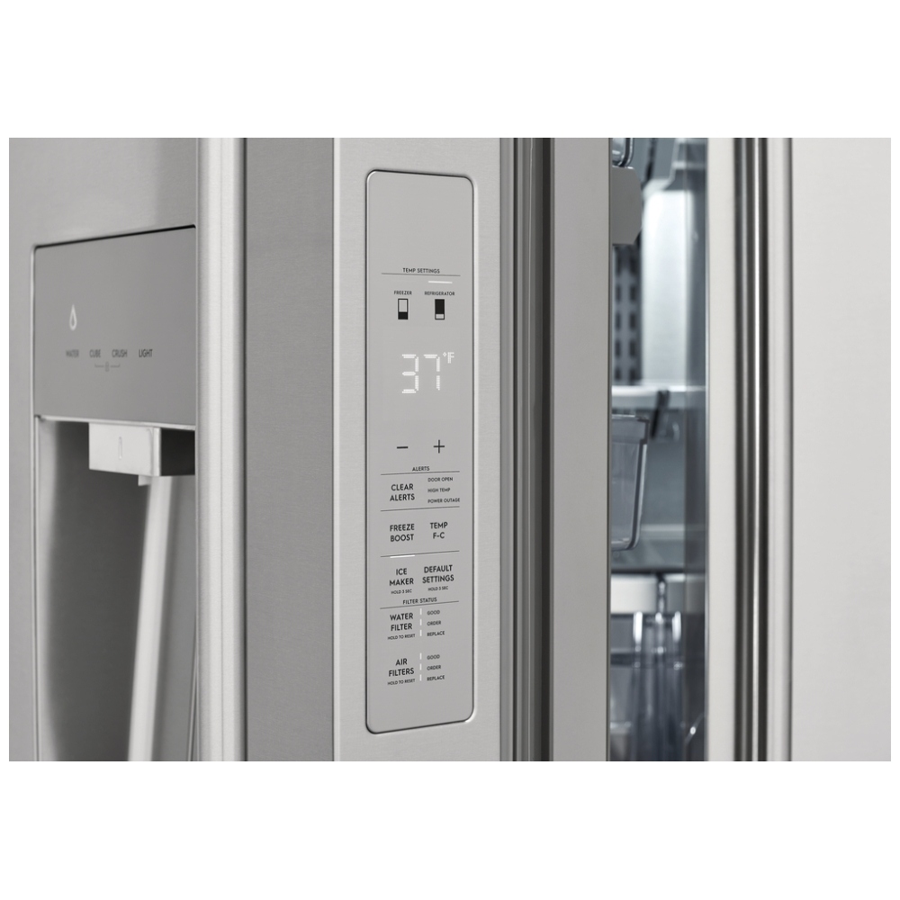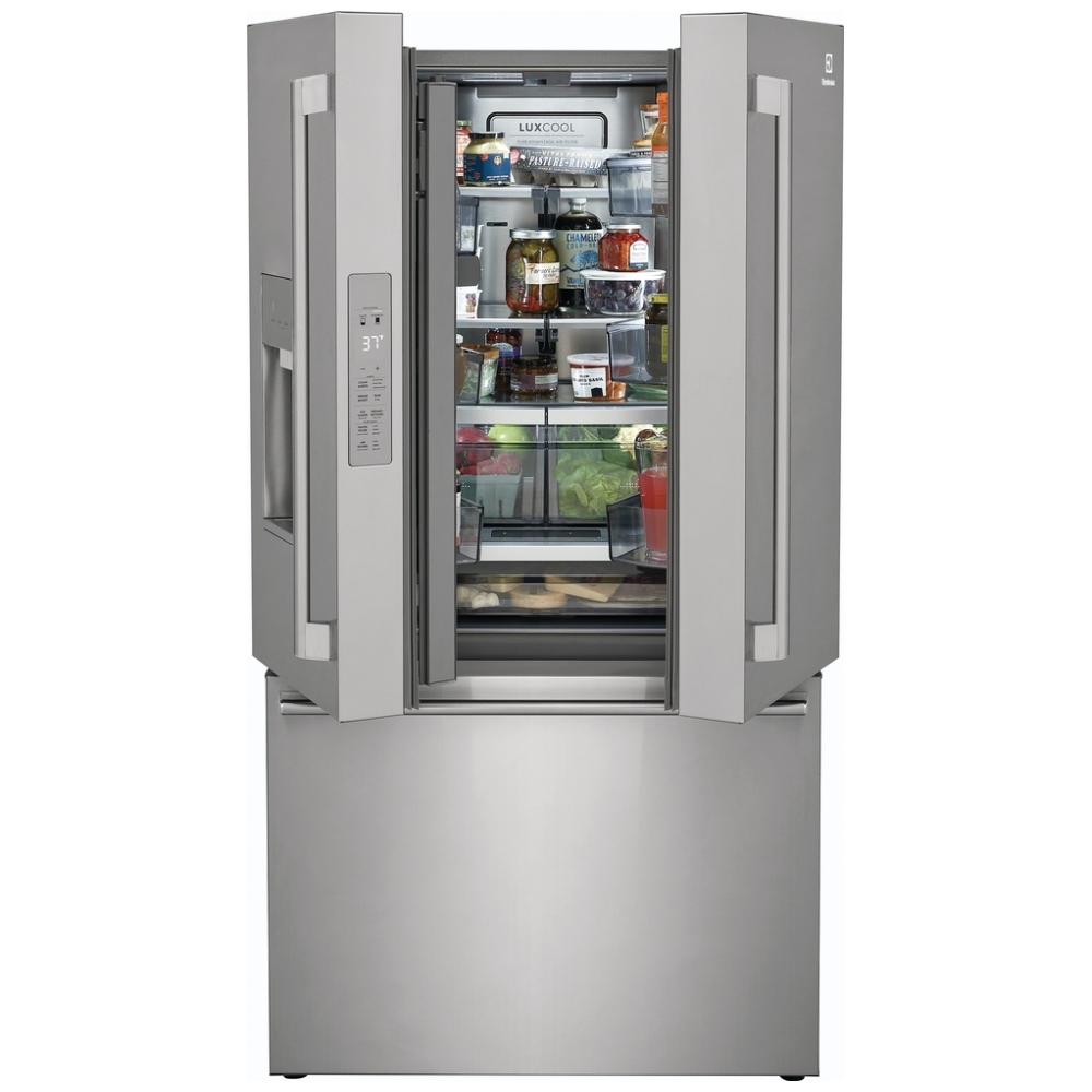 Introducing the Electrolux ERFC2393AS French Door Refrigerator, a beautifully designed appliance that combines style with intelligent features to elevate your kitchen experience. With a generous capacity of 22.6 cubic feet and a sleek stainless steel finish, this refrigerator offers both functionality and sophistication.