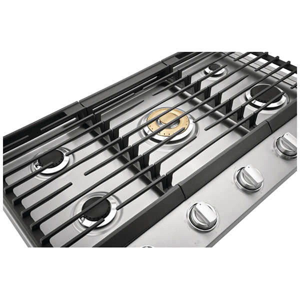 The continuous cast-iron grates allow you to glide even your heaviest cookware smoothly from one burner to another, enhancing both convenience and the sleek, modern look of the cooktop.