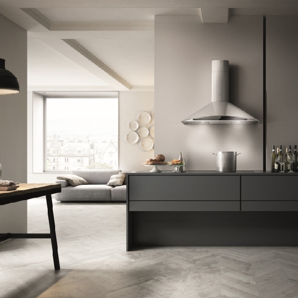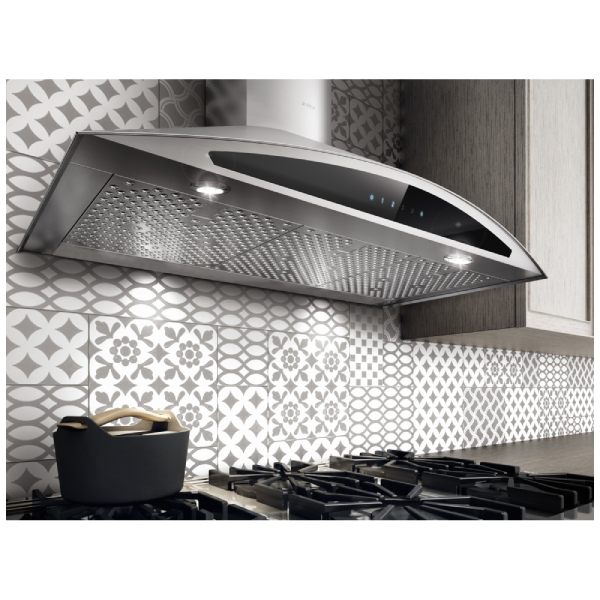 Dynamic and elegant, the Foglia range hood features a gently arched front that softens its profile, providing an angled panel for easy access to the controls.