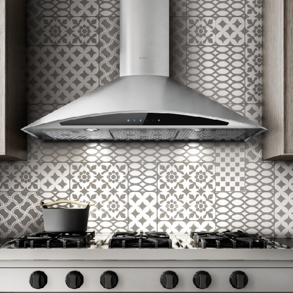 This Foglia wall-mount range hood features a Hush system, Touch control, and two premium LED lights.