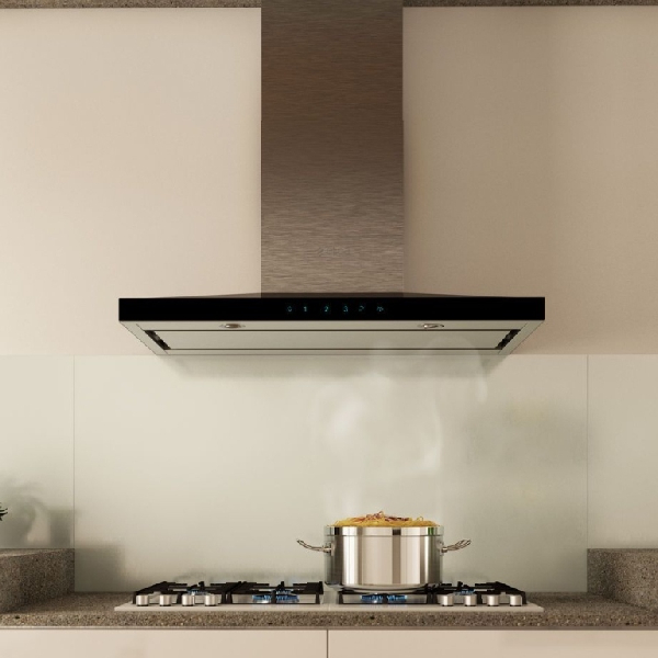 A sleek pairing of glass and brilliant stainless steel makes this range hood a striking addition to any kitchen, seamlessly blending with other appliances.
