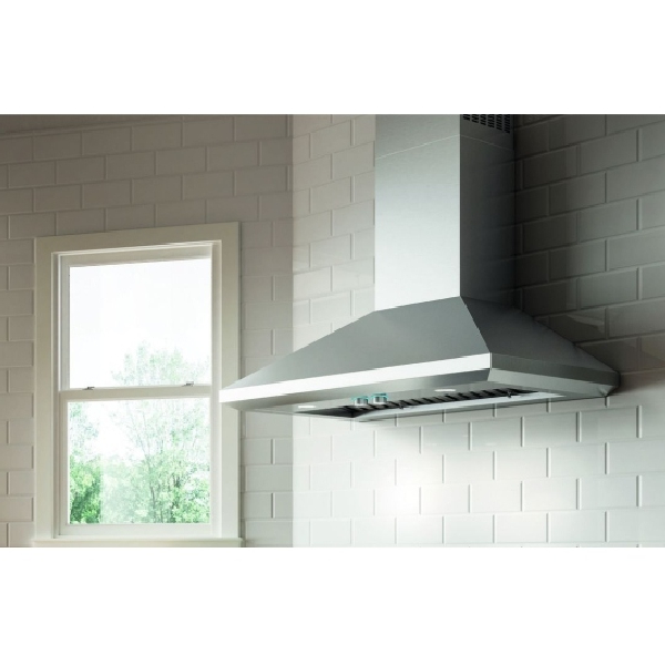 48 inch Exterior Width, Chimney, Wall Mounted, 1200 CFM, Outside / Ducting, LED, Baffle Filter, Stainless Steel color, Blower Included