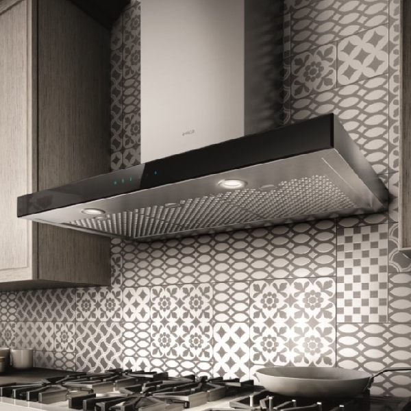 Elica EMZ636S3 Range Hood, 36 inch Exterior Width, Chimney, Wall Mounted, 600 CFM, LED, Dishwasher Safe Filters, Black Glass colour Blower Included