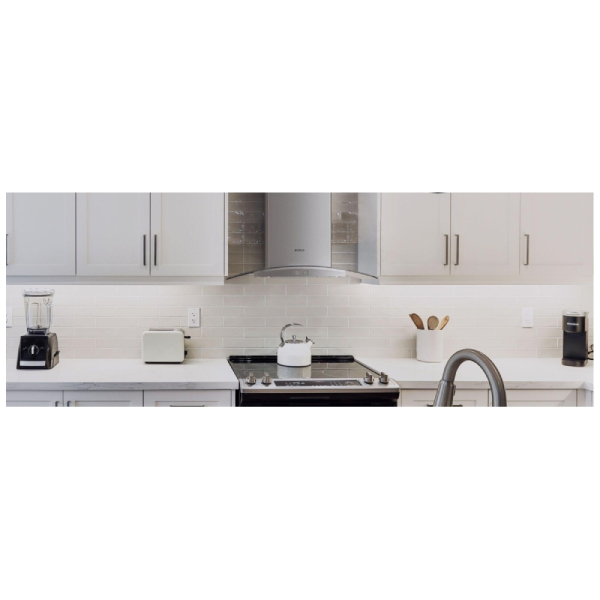 Available in 30" or 36" widths, Potenza features a robust 400 CFM blower that can handle the cooking demands of most kitchens. The backlight color touch controls illuminate in elegant white, green, blue, or red, managing multiple functions, including LED lighting and a 4-speed blower. Additionally, Potenza comes with a telescopic chimney, suitable for ceilings up to 8' 5".
