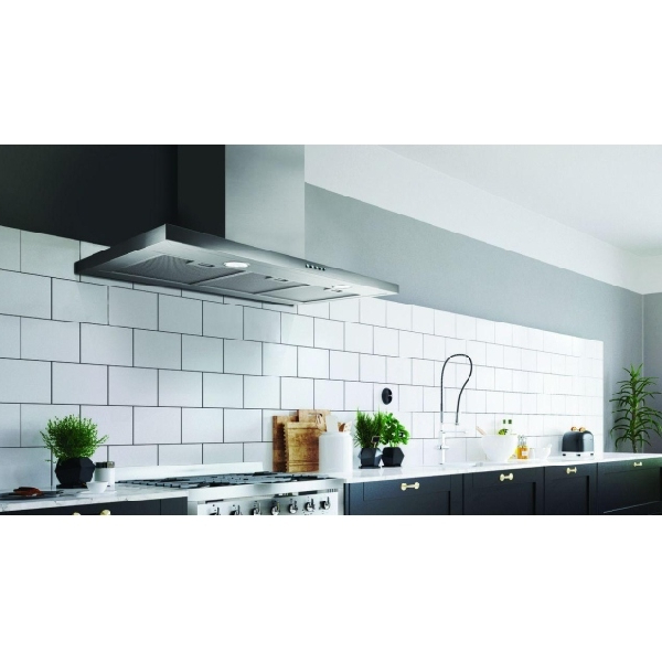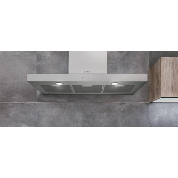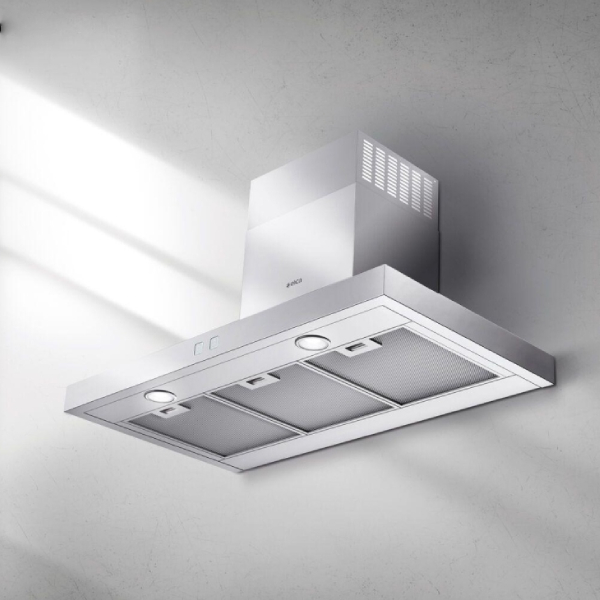 Designed for both standard ducted installation and recirculating setups with an additional kit. It includes Elica's Hush System, reducing noise levels by up to 35%, and long-lasting LED lighting with over 20,000 hours of expected lifespan.
