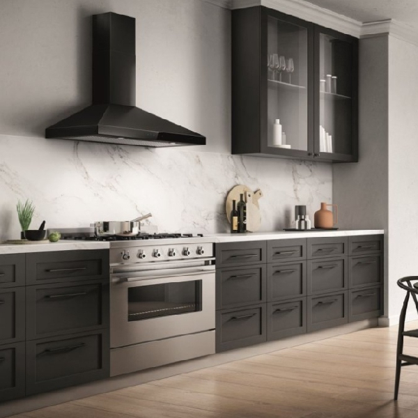 The Varna Black combines clean lines and elegantly sloping angles, embodying an Italian classic that enhances any kitchen. Elica's black stainless finish offers a uniquely rich appearance, effortlessly concealing fingerprints.
