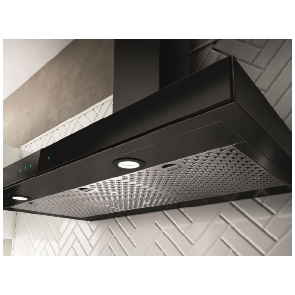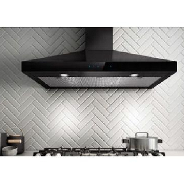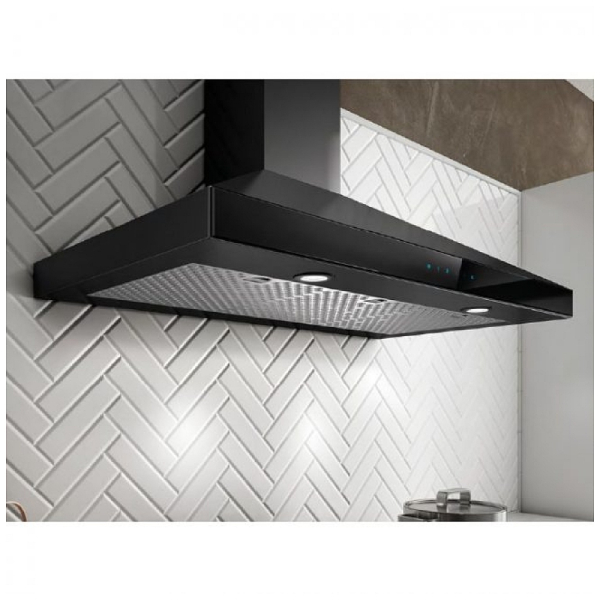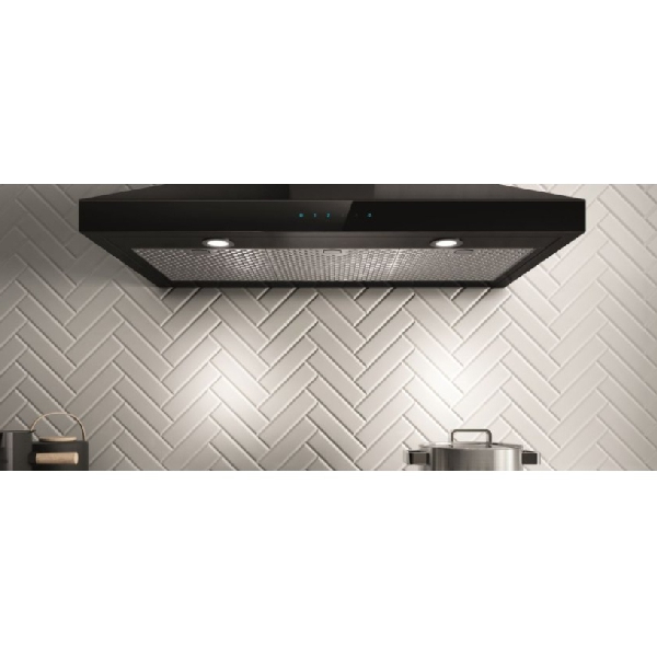 Varna Black features dimmable LED lighting, durable stainless steel microhole filters, and discreet glass touch controls that remain hidden when not in use. It includes HUSH Sound Suppression technology, reducing noise levels by up to 35%, allowing for quiet cooking and entertaining. The hood is adaptable for recirculating installation with the available Recirculating Kit.