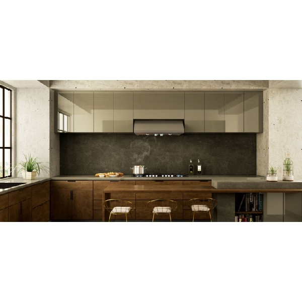 The Cervinia range hood offers high efficiency for your kitchen, available in 30" and 36" widths and standing at only 11" high. It is a streamlined version of the full-size Calabria model, designed for those who seek both performance and style.