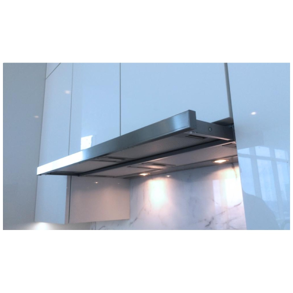 For a sleek and sophisticated look in your kitchen, the Faber Cristal slide-out hood offers an integrated design with a stainless steel pull-out visor that neatly tucks away when not in use. This innovative hood allows for complete integration with your kitchen cabinetry by replacing the front strip with a material that matches your cabinets, ensuring a seamless blend into your kitchen decor.