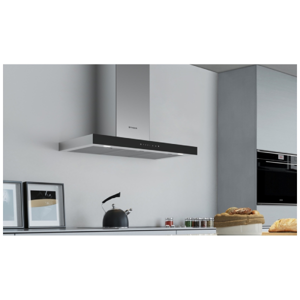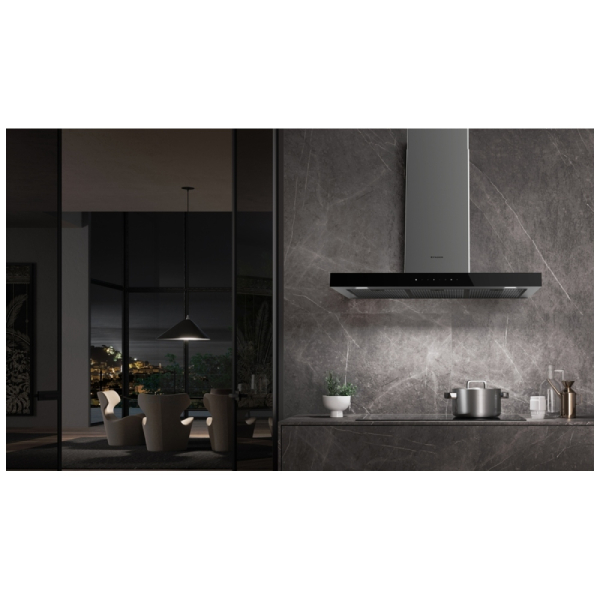 Elevate your kitchen with the Stilo Glass Wall-Mount Chimney Hood. Featuring a striking black glass and stainless steel design, this hood combines modern aesthetics with exceptional performance. With its discreet touch controls and advanced functionality, it ensures a fresh and odor-free environment, while its 24-hour pollution control keeps your kitchen air clean.