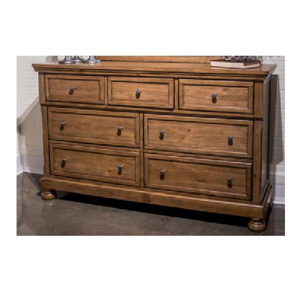 Bring timeless charm and practical functionality to your bedroom with the Feddinger Dresser, available exclusively at Teletime. Designed with a relaxed take on traditional style, this dresser blends classic elegance with a laid-back sensibility, making it a perfect fit for any inviting retreat. Its rich chestnut brown wood tone, enhanced by a complex blend of stain and glaze, adds warmth and sophistication to your space. Thick-profiled mouldings, fluted pilasters, and breakfront crowns with inset dentil trim lend a refined architectural touch that elevates the overall design.