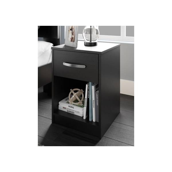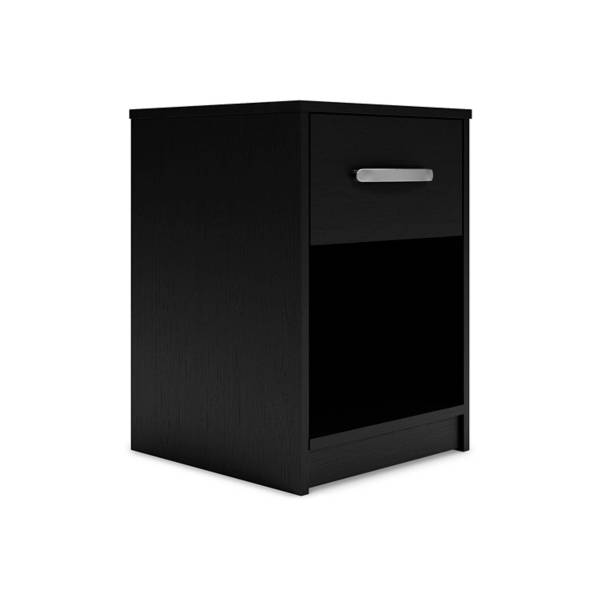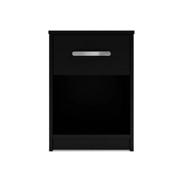 Its matte black finish with a subtle replicated wood grain adds a touch of understated elegance, making it a timeless addition to your room. A smooth-gliding drawer, set on metal ball bearings, provides a convenient place to store nighttime essentials, ensuring easy access with a seamless pull. Below, an open cubby space offers additional storage for decorative accents, books, or baskets—helping you maintain a clean and organized bedside.