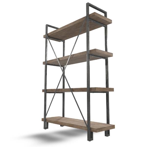 An urban eclectic bookshelf with a gray x-backed metal frame and four fixed gallery shelves. Ideal for displaying books, succulents, or picture frames with stylish sturdiness.
