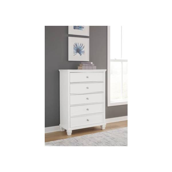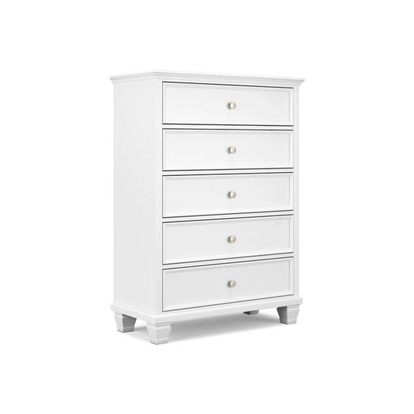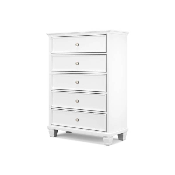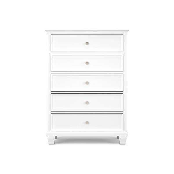 The Fortman Five Drawer Chest brings timeless elegance to your bedroom with its effortlessly sophisticated design. Featuring a clean, contemporary white finish, this piece seamlessly blends with a variety of interiors, from classic to modern. Its framed drawer fronts and sleek round metal knobs in a satin nickel-tone finish add a touch of refined simplicity, making it a versatile addition to any space.