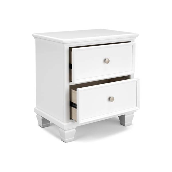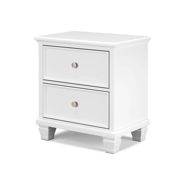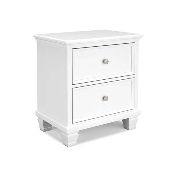 Bring refined elegance and timeless charm to your bedroom with the Fortman Two Drawer Nightstand, available exclusively at Teletime. Designed with a fresh and casual aesthetic, this nightstand features a crisp white painted finish that effortlessly brightens any space and complements a wide range of interior styles—from classic to contemporary. The framed drawer fronts and traditional tapered feet add a subtle touch of sophistication, while round metal knobs in a satin nickel-tone finish enhance its clean and polished appearance.