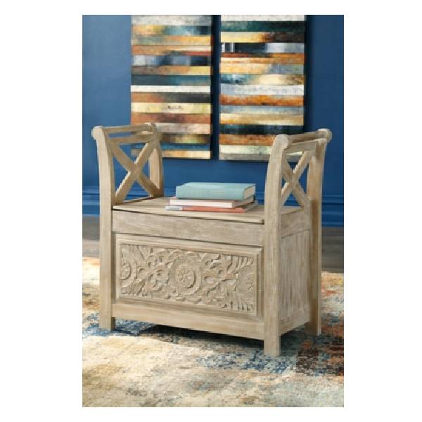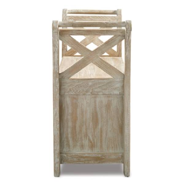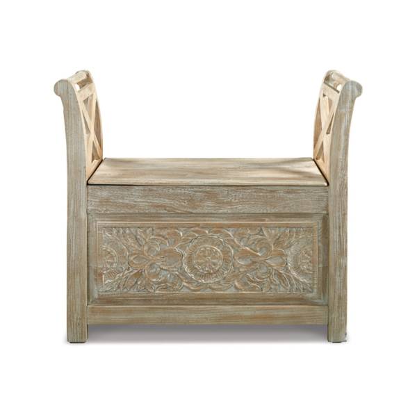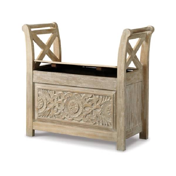 A bohemian-inspired accent bench with a whitewashed finish, carved floral details, and X-design arms. Features a hinged seat for hidden storage, crafted from solid and engineered wood.