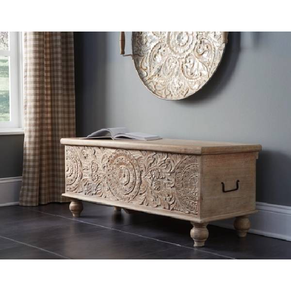 Combine practicality with distinctive style with this exceptional storage bench. Crafted from solid wood and finished in an antique white, it offers a blend of classic charm and unique flair. The black metal handles and hand-carved ornamental medallions showcase exquisite artistry, making this bench a standout piece in any room. The hinged top opens to reveal ample storage space, perfect for keeping your essentials organized yet out of sight. Enhance your decor with this visually striking and functional addition.