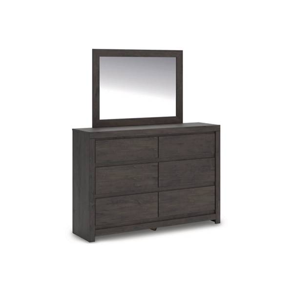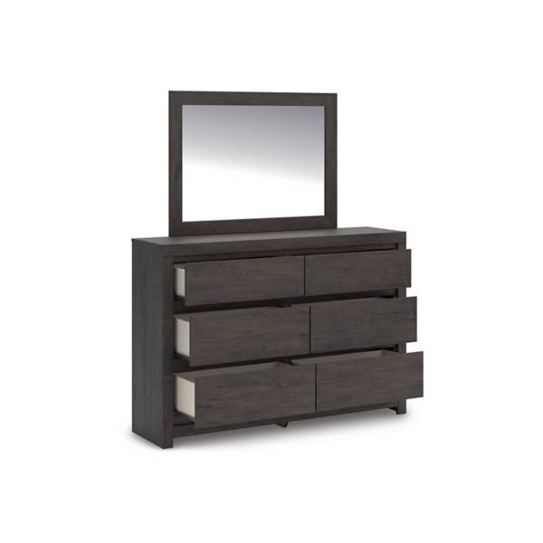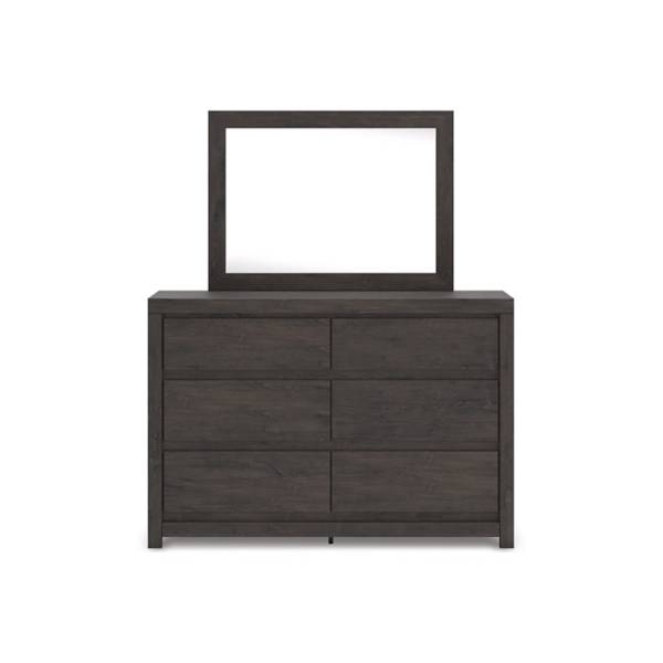 Elevate your bedroom with the understated elegance of the Fraluna Dresser and Mirror set—where modern design meets serene simplicity. Showcasing clean lines and a rich dark charcoal finish over a replicated oak grain, this beautifully crafted piece brings a sleek, contemporary feel to your space. The hardware-less design, highlighted by recessed hand grabs, creates a smooth, minimalist aesthetic that feels effortlessly refined.