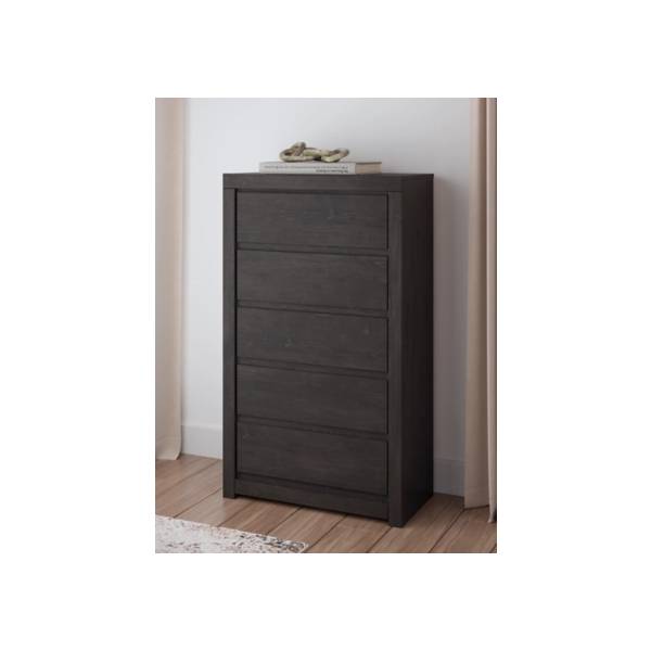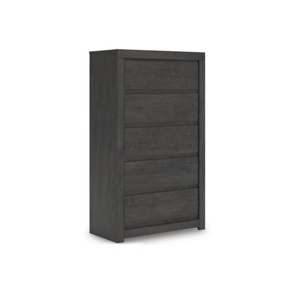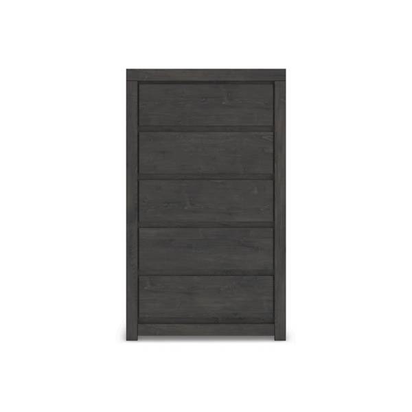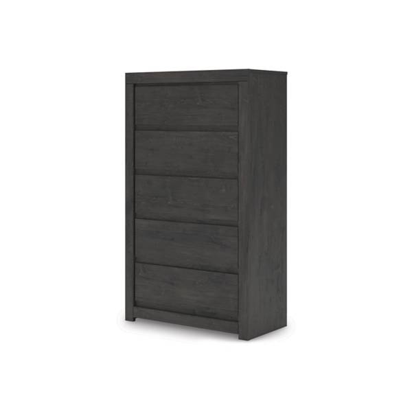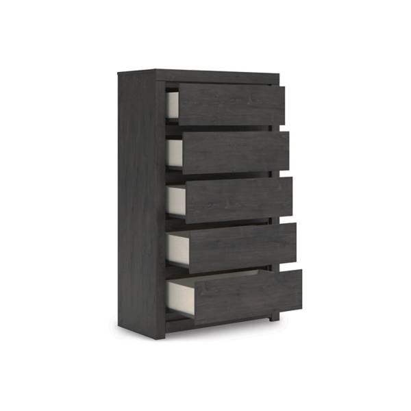 The Fraluna Five Drawer Chest embodies modern elegance with its clean lines and dark, neutral tones. Designed for both style and practicality, its sleek, hardware-free aesthetic offers a refined and fuss-free look. The deep charcoal finish over a replicated oak grain adds a touch of sophistication, seamlessly blending with contemporary interiors.