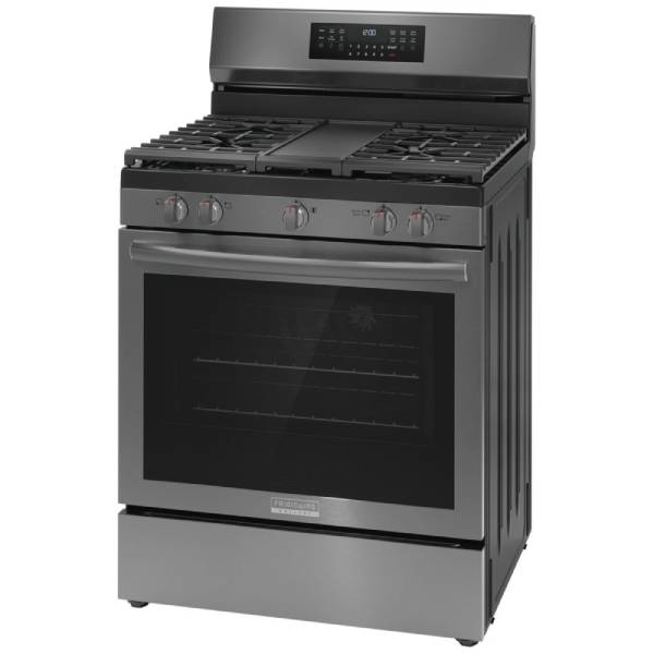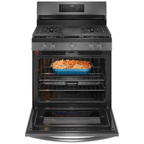 The Frigidaire Gallery GCRG3060BD Gas Range is a modern culinary powerhouse designed to meet all your cooking needs with style and precision. Featuring a 30-inch exterior width in a sleek Black Stainless Steel finish, this range is as functional as it is visually striking. Its Smudge-Proof® Stainless Steel resists fingerprints and ensures easy cleaning, making it a perfect fit for busy households. With a generous 5.1 cu. ft. capacity, this gas range offers plenty of space for baking, roasting, and cooking large meals, all while maintaining a clean and elegant look.
