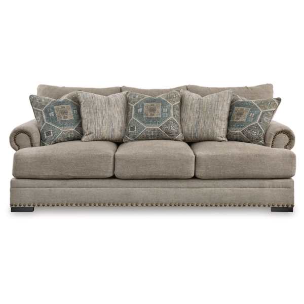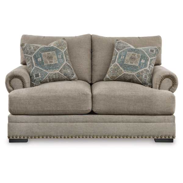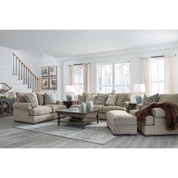 The Galemore Sofa, Loveseat, Chair, and Ottoman (SKU - PKG019283) set is designed to bring a touch of contemporary elegance to your living space. Featuring a clean-lined silhouette with roll arms and nailhead accents, this collection exudes modern sophistication. The plush upholstery in tonal colors not only adds visual appeal but also offers a soft and comfortable seating experience. Its versatile design ensures it complements various interior décor styles, making it a timeless addition to any home.
