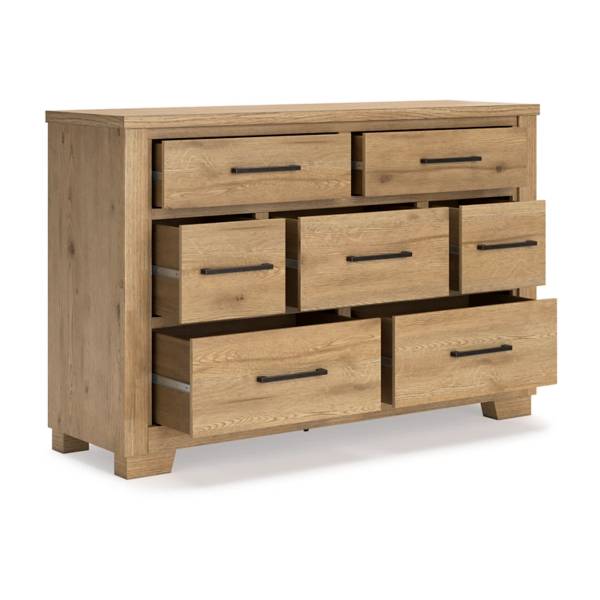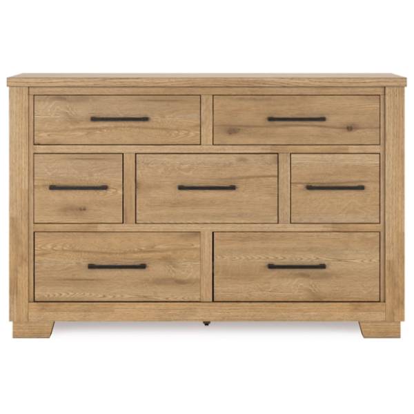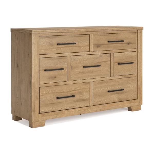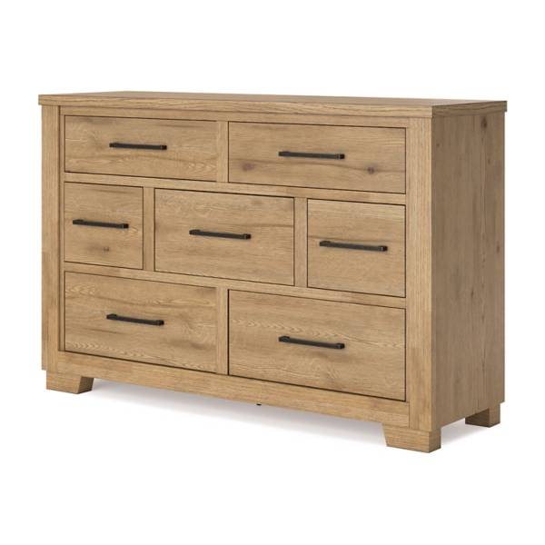 Made with durable hardwood solids and thick rustic oak veneer, the Galliden Dresser is built to stand the test of time. Its seven spacious drawers feature fully finished interiors, dovetail construction, and smooth ball-bearing side glides for lasting functionality. Thick metal bar pulls, finished in aged bronze with a hammered texture, add a striking industrial touch that contrasts beautifully with the warmth of the wood. Whether you’re aiming for a cozy retreat or a contemporary sanctuary, this dresser brings timeless elegance and practical storage to your space.
