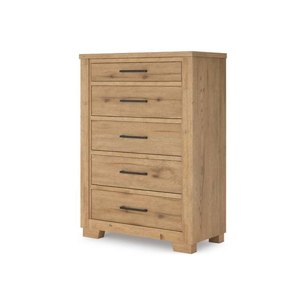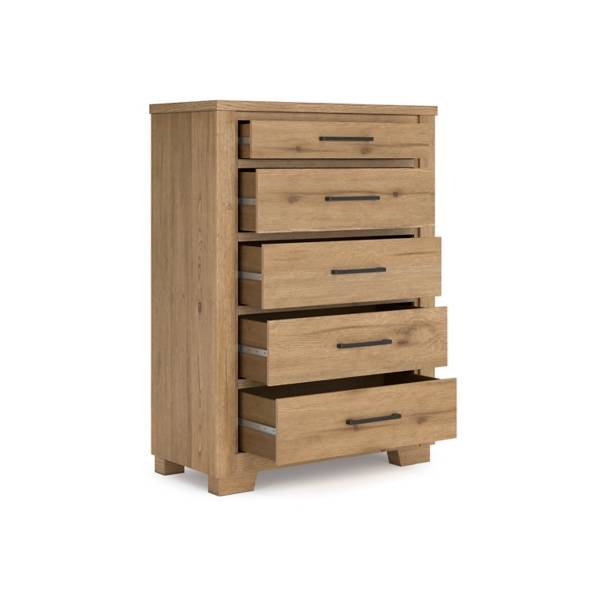 The stunning simplicity of the materials ensures that this chest complements your existing furnishings, while its striking presence elevates the overall aesthetic of your space. The five spacious drawers offer plenty of storage, with fully finished interiors that reflect the chest’s impeccable craftsmanship. Featuring dovetail construction and ball-bearing side glides, the drawers open and close effortlessly for years to com
