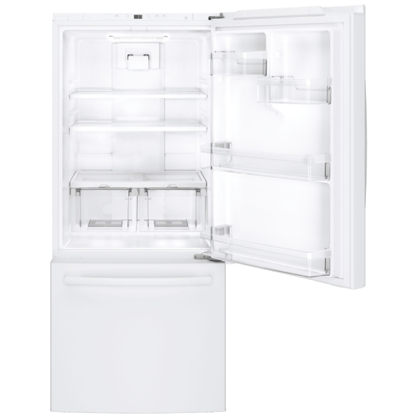 With a generous 20.9 cu. ft. capacity, the GE GDE21DGKWW Bottom Mount Refrigerator provides ample space for all your food and beverage storage needs. Its spacious interior includes adjustable shelves and door bins, allowing you to customize the layout to suit your preferences.