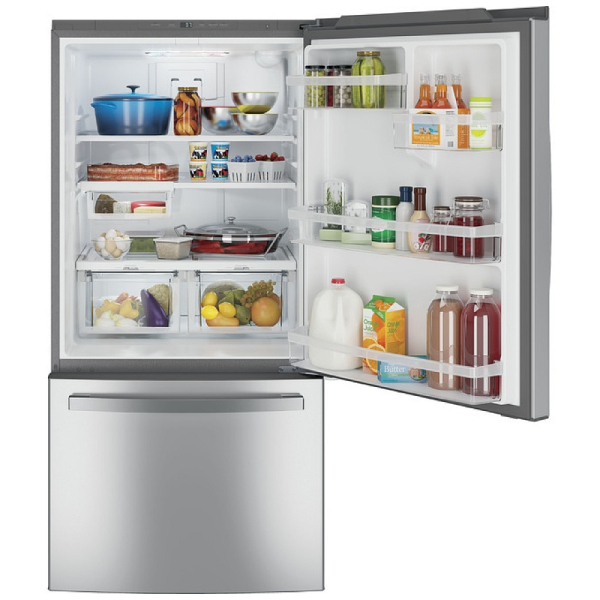 If you're searching for a stylish and energy-efficient refrigerator that meets all your food storage needs, the GE GDE25EYKFS Bottom Mount Refrigerator is an excellent choice. Boasting a generous 24.8 cu. ft. capacity, this refrigerator provides ample space for all your favorite snacks, beverages, and ingredients.