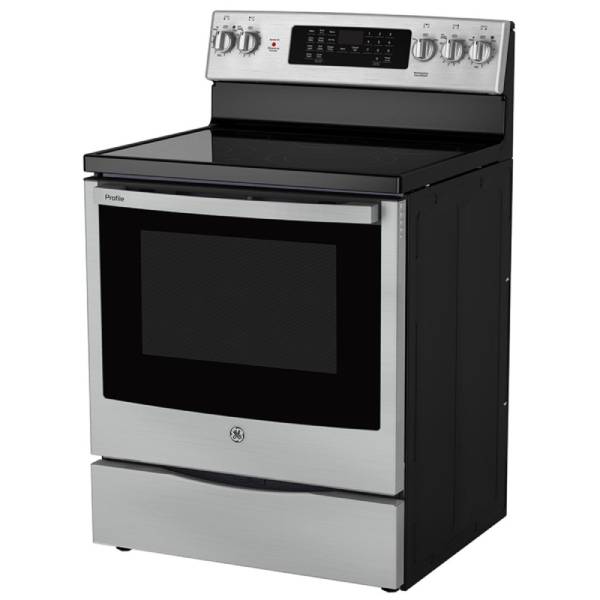 GE Profile PCB905YVFS Electric Range, 30 inch Exterior Width, Self Clean, Convection, 5 Burners, 6.2 cu. ft. Capacity, Storage Drawer, Air Fry, 1 Ovens, Stainless Steel colour True European Convection