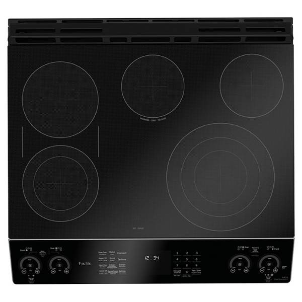 GE Profile PCS980YMFS Electric Range, 30 inch Exterior Width, Self Clean, Convection, 5 Burners, 6.7 cu. ft. Capacity, Air Fry, 2 Ovens, Stainless Steel colour True European Convection, Self Clean Racks, Telescopic Gliding Extension Rack