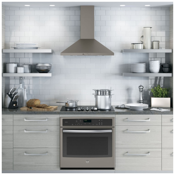 GE JVW5301EJESC Range Hood, 30 Inch Width, Chimney, Wall-Mounted, 350 CFM, Halogen Lighting, Dishwasher Safe Filters, Slate Finish