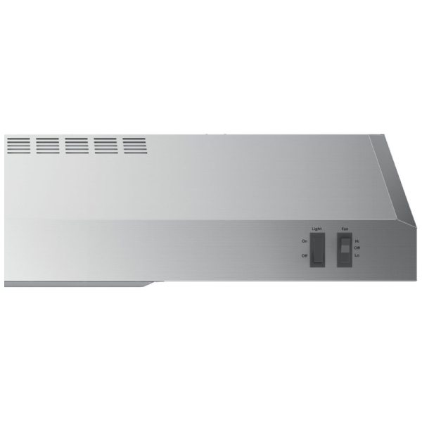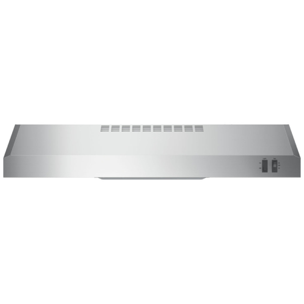 GE JVX3300SJSSC Range Hood, 30 inch Exterior Width, Under-Cabinet, Under-Cabinet, 200 CFM, Outside / Ducting, Halogen , Dishwasher Safe Filters, Aluminum Mesh, Stainless Steel colour Blower Included