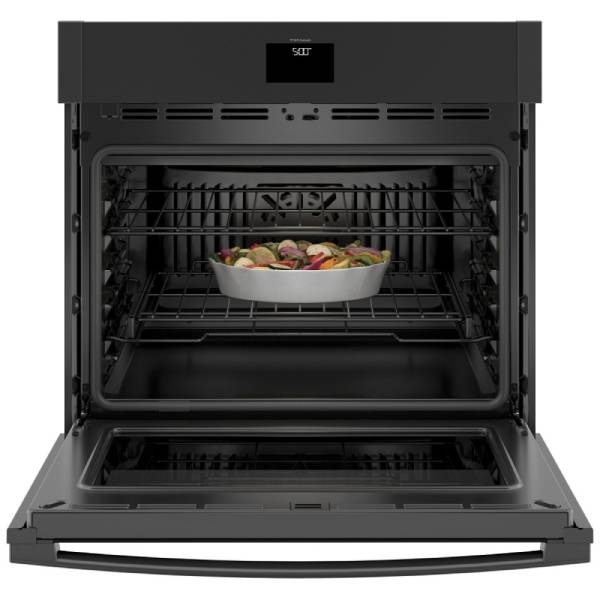 The GE JTS5000DNBB Single Wall Oven in sleek black offers a 30-inch exterior width, bringing both elegance and functionality to your kitchen. This oven is designed to deliver superior cooking results with True European Convection, using a convection fan and a third heating element to ensure faster, more even cooking. Whether you're baking, roasting, or broiling, every dish is cooked to perfection.
