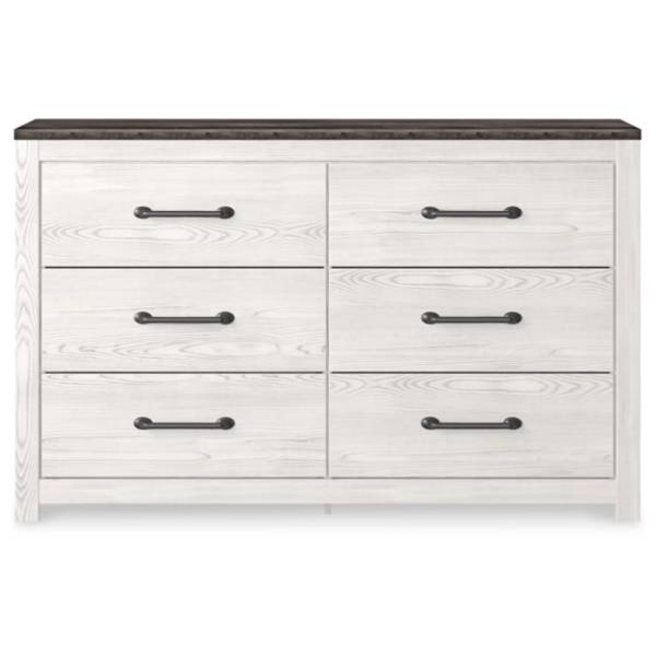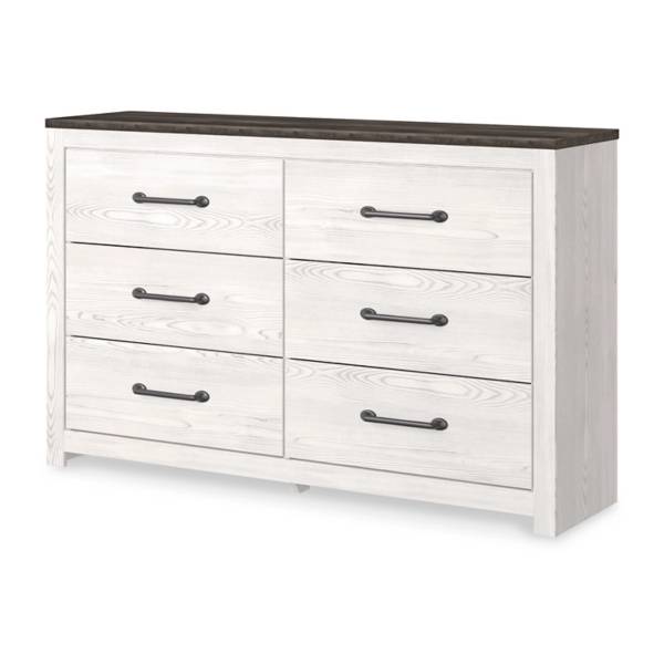 Bring a touch of modern simplicity to your bedroom with the Gerridan Six Drawer Dresser, available at Teletime. Its wispy whitewash finish, paired with a rustic gray planked replicated oak grain, creates a calming and contemporary atmosphere. The authentic texture adds a natural touch, while the large-scale dark handles enhance the dresser’s sleek, modern appeal.