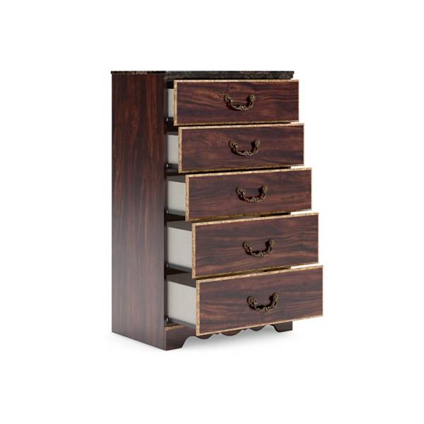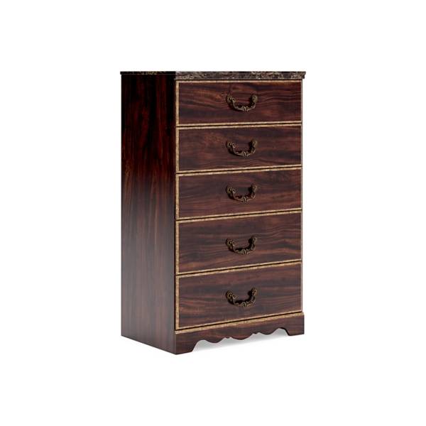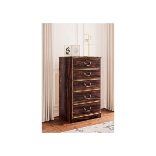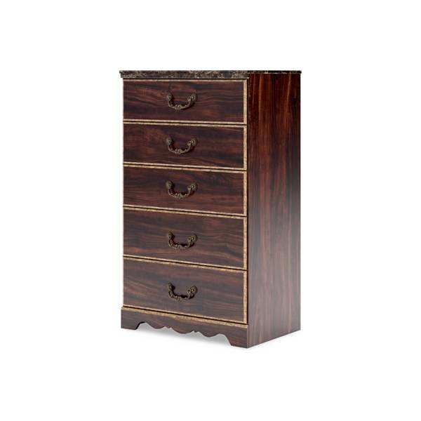 Introduce timeless elegance to your bedroom with the Glosmount Five Drawer Chest, available exclusively at Teletime. This grand and sophisticated design is beautifully accented by a glossy reddish-brown finish over replicated cherry grain, paired with a striking faux stone element that adds a touch of traditional charm. From every angle, this chest showcases a refined aesthetic that stands the test of time.