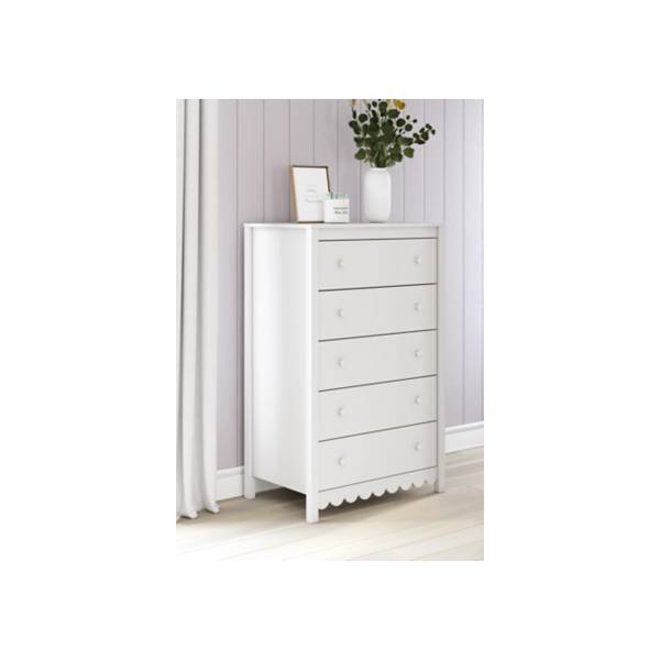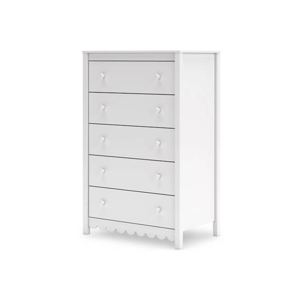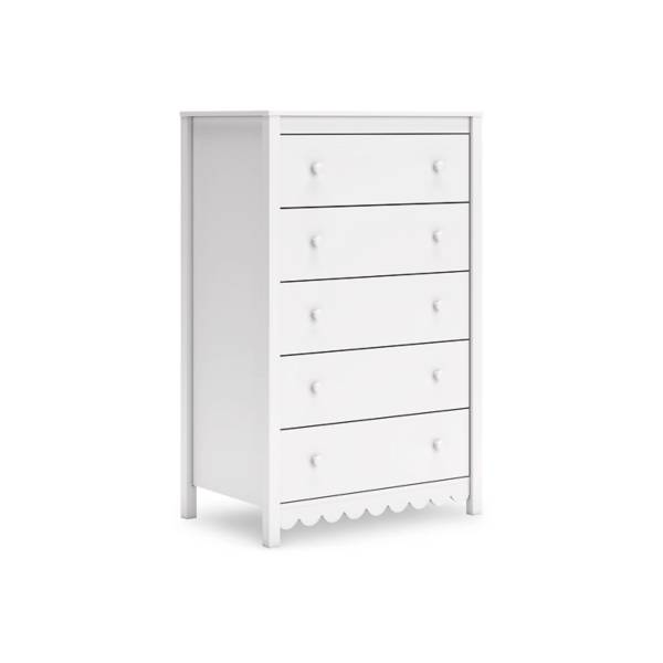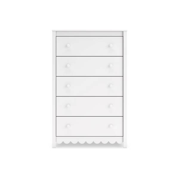 The Hallityn Five Drawer Chest from Teletime brings a charming and playful vibe to your bedroom with its delightful scalloped design. This elegant piece is an ideal choice for cottage or coastal farmhouse-inspired interiors, seamlessly blending traditional elements with contemporary flair. The matte white finish serves as a versatile canvas, allowing you to effortlessly showcase your unique sense of style and creativity.