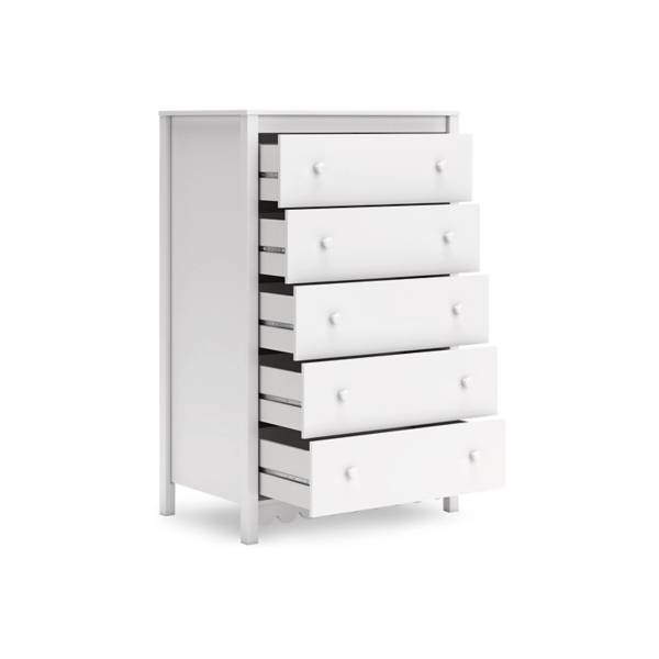 Crafted with engineered wood and decorative laminate, this chest strikes the perfect balance between affordability and durability. Its five smooth-gliding drawers, featuring vinyl-wrapped sides and backs for enhanced longevity, provide ample storage space to keep your belongings neatly organized and clutter-free. The thoughtful drawer construction ensures a hassle-free experience, extending fully for easy access while maintaining safety and stability.