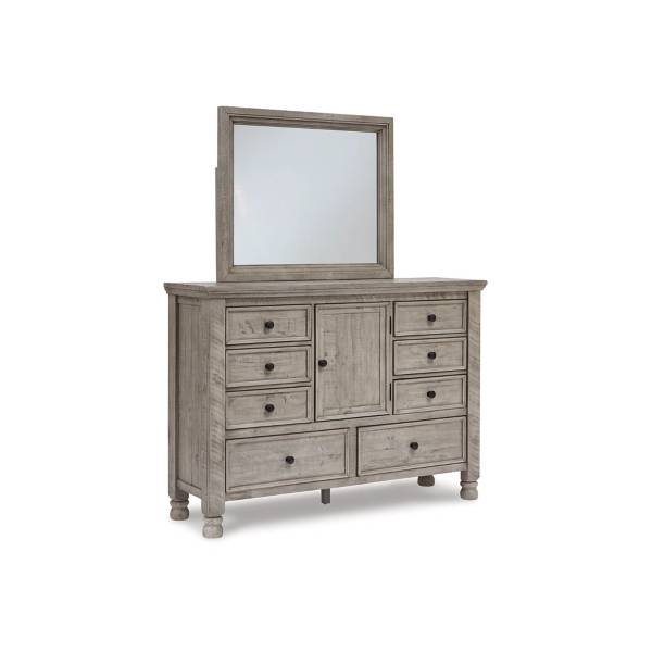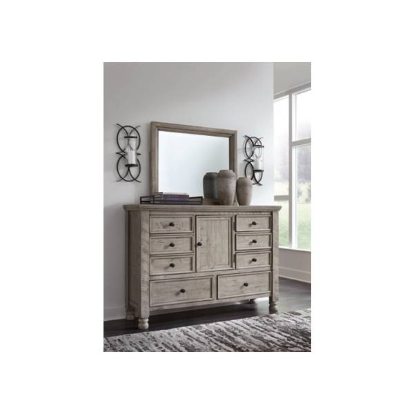 Bring the charm of countryside grandeur into your bedroom with the Harrastone Dresser and Mirror, available at Teletime. With its substantial presence, weathered light gray finish, and intricate moulding details, this set captures the essence of timeless beauty. Crafted from pine wood and veneers with a distressed surface texture, it exudes a rustic elegance that feels both classic and comforting.