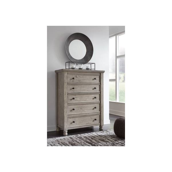 The Harrastone Five Drawer Chest offers spacious storage with an elegant weathered light gray finish that adds a timeless charm to any bedroom. Crafted from durable pine wood, veneers, and engineered wood, it features five smooth-gliding drawers with dovetail construction for functional organization. The chest's sturdy design is complemented by chunky posts, thick moldings, and antiqued iron-tone hardware, ensuring long-lasting stability and style