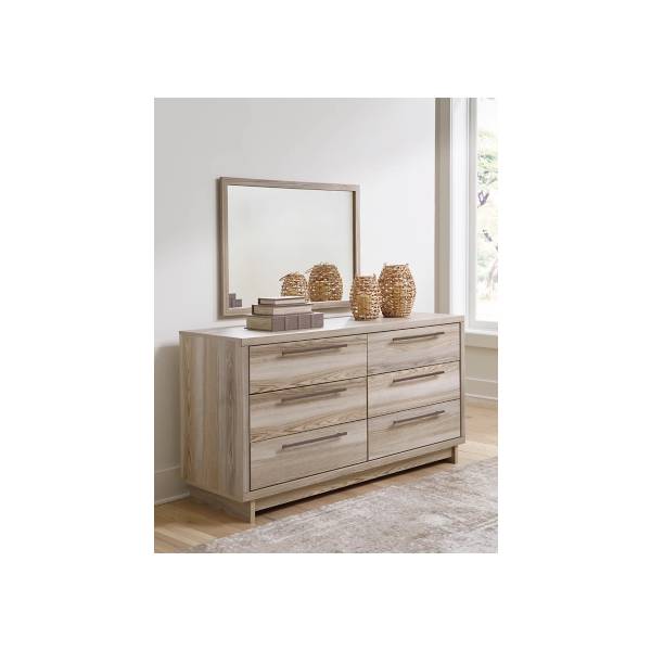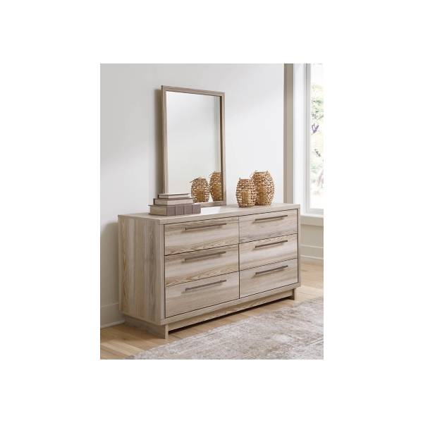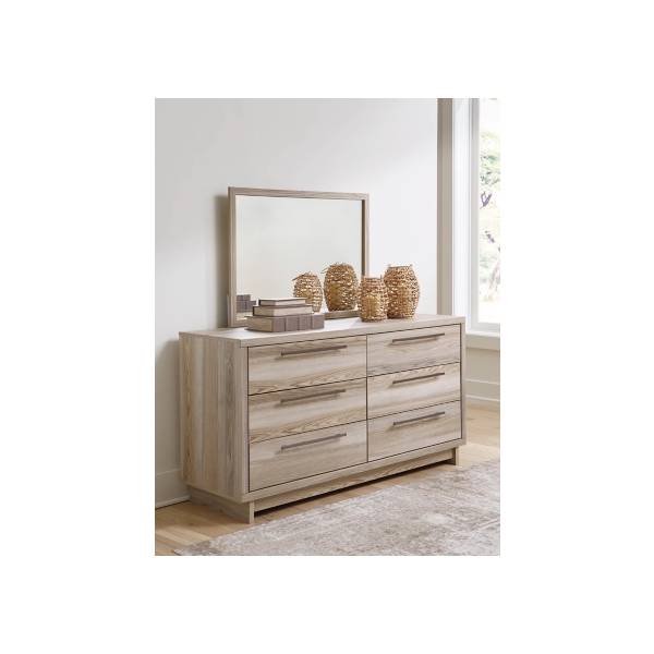 Add a fresh touch of sophistication to your bedroom with the Hasbrick Dresser and Mirror set, available exclusively at Teletime. Designed with a perfect blend of modern minimalism and relaxed elegance, this set features a natural wood-look finish with subtle replicated grain that brings warmth and texture to any contemporary space. The clean lines and framed front detailing offer a sleek, refined aesthetic, while the elongated champagne-toned handles add a touch of understated luxury. Six spacious, smooth-gliding drawers provide practical storage, each lined with faux linen laminate for a polished and clean interior finish. The coordinating mirror enhances the dresser’s contemporary appeal, offering both style and functionality as part of your daily routine. Built with durable engineered wood and decorative laminate, this set is crafted for lasting performance and affordability. Prioritizing safety and quality, it meets the latest ASTM standards for stability. Discover modern simplicity with timeless charm—only at Teletime.