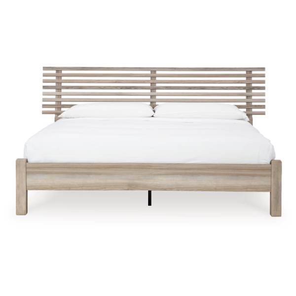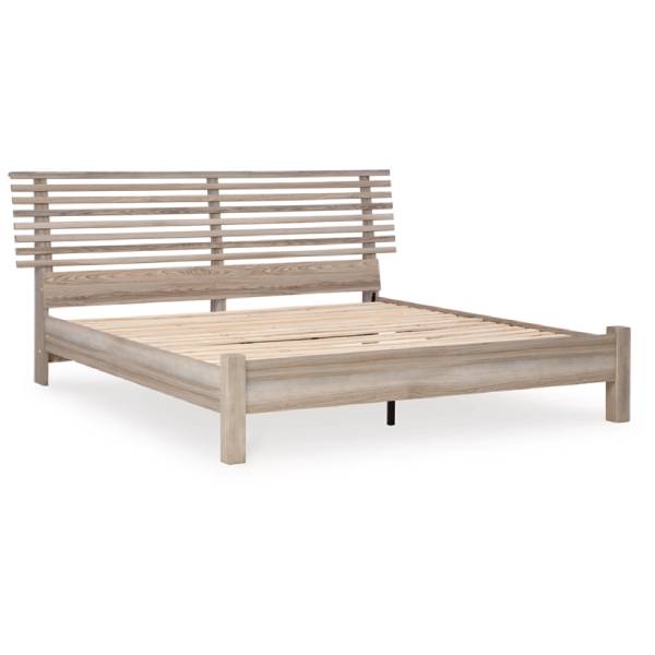 The Hasbrick King Slat Panel Bed effortlessly blends modern design with neutral sophistication, making it the ideal centerpiece for any bedroom. Its clean lines and striking open slat headboard introduce a fresh, eye-catching aesthetic that immediately elevates your space. The natural finish, paired with a subtle replicated wood grain, radiates a sense of casual elegance, while the overall design evokes a smart, contemporary style perfect for creating a tranquil retreat.