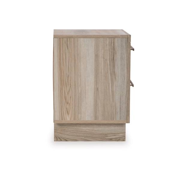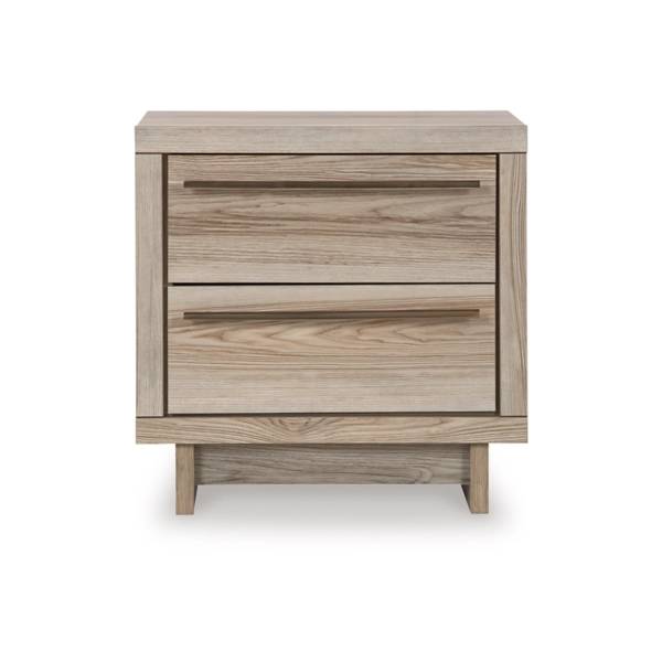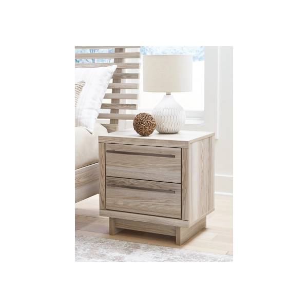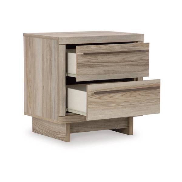 Elevate your bedroom with the effortlessly refined design of the Hasbrick Two Drawer Nightstand, available at Teletime. Blending modern style with a naturally sophisticated finish, this nightstand brings warmth and contemporary charm to your personal space. Its light natural tone, subtle replicated wood grain, and clean lines create a calming aesthetic that’s both inviting and timeless.