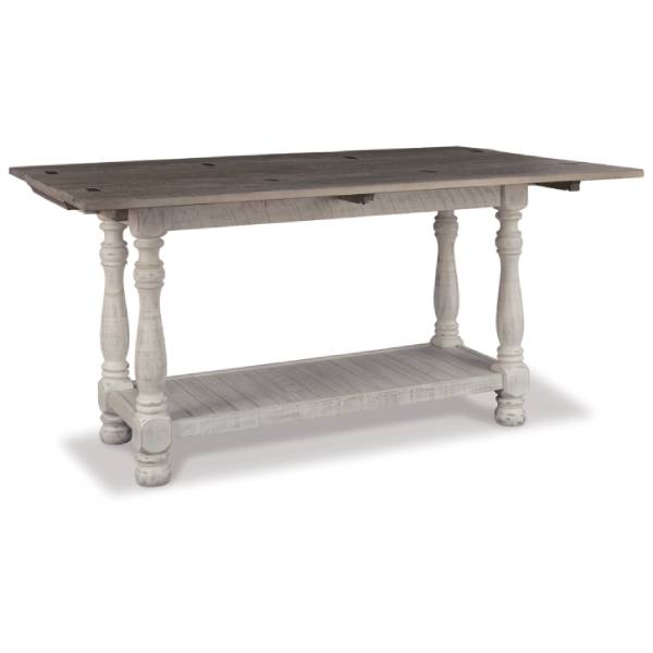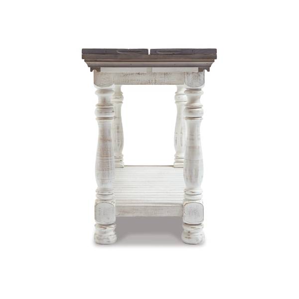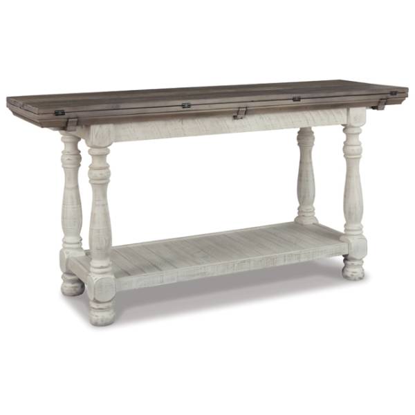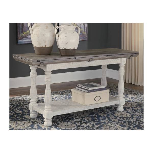 The Havalance Flip-Top Sofa Table (SKU - T814-4) from Teletime is a stunning blend of rustic charm and versatility. Featuring a distressed two-tone finish, it combines a weathered gray top with a vintage white base, creating a timeless, rustic look that adds character to any room. Made of pine wood, pine veneer, and engineered wood, this piece is crafted for both style and durability.