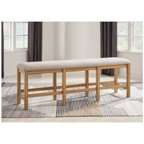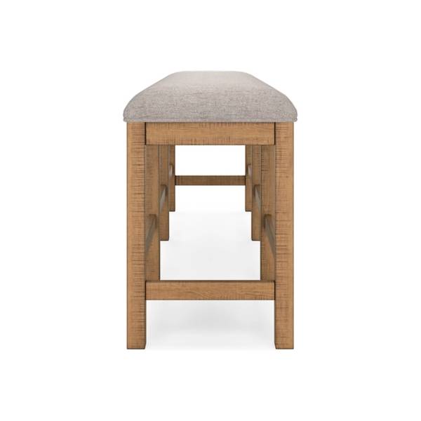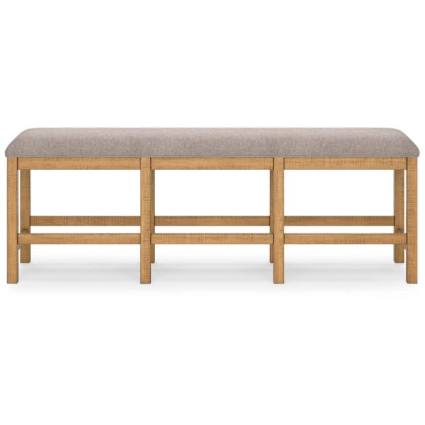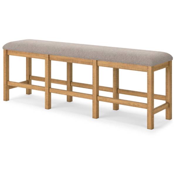 A rustic counter height dining bench with a distressed light brown pine finish and textured upholstered seating. Offers versatile, comfortable seating with a foam cushion. Assembly required.