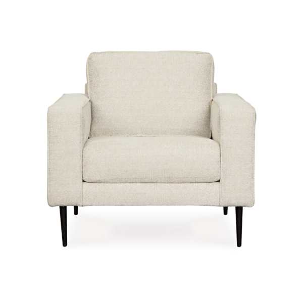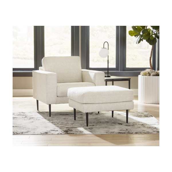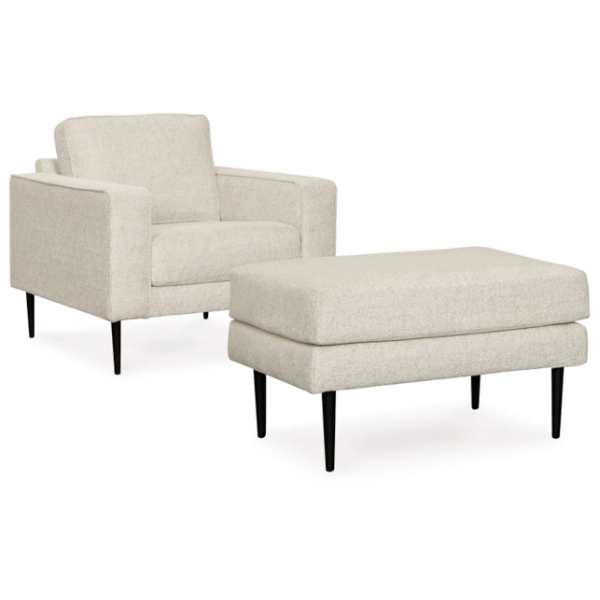 The Hazela Chair and Ottoman set combines simple comfort with modern functionality, making it an ideal choice for small spaces and apartments. Designed with a slim profile, this set offers cozy seating without overwhelming your space. The subtle chevron pattern on the cushions enhances the neutral upholstery, adding a refined touch that complements various décor styles. Black metal accent legs provide a contemporary edge, while included bolster pillows add extra comfort and support. Built with a durable platform foundation system, the chair and ottoman resist sagging and maintain their shape over time. Whether you're unwinding after a long day or entertaining guests, this stylish duo delivers both comfort and sophistication.