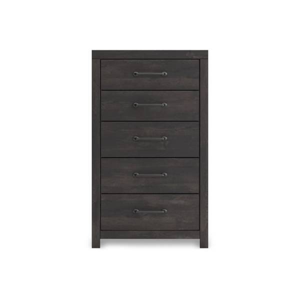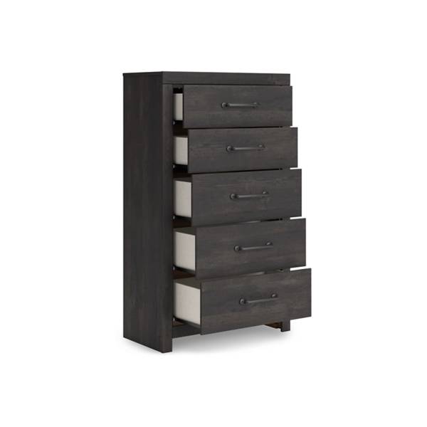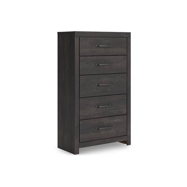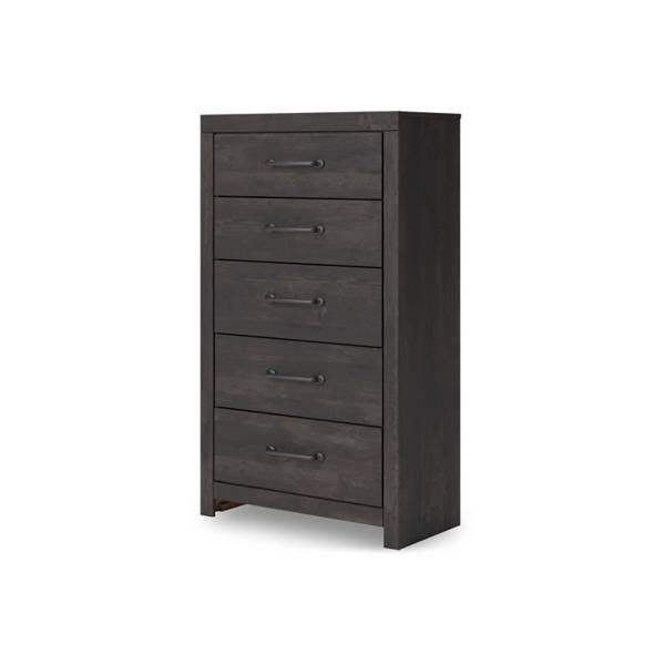 The Hollivern Five Drawer Chest features a rustic charcoal finish over replicated oak grain, offering a neutral and sophisticated look. Its five smooth-gliding drawers, adorned with large-scale dark-colored handles, provide ample storage space. Constructed with engineered wood and decorative laminate, the chest ensures durability and affordability