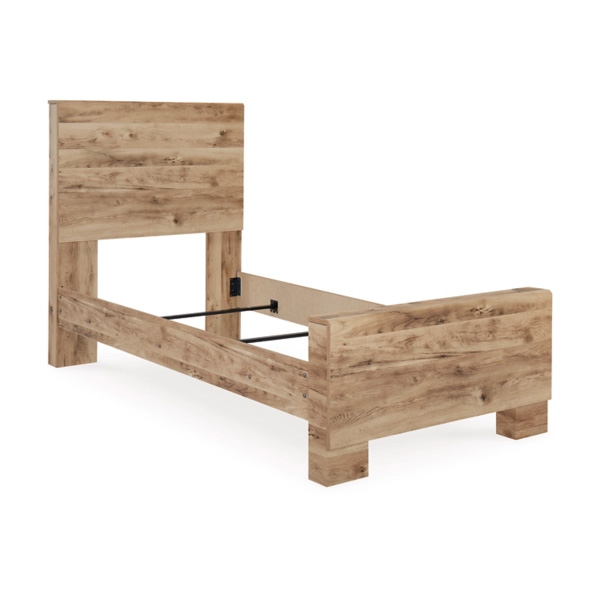 Crafted from durable engineered wood and quality veneers, the Hyanna Twin Panel Bed ensures long-lasting performance. The sturdy panel headboard and footboard showcase the natural wood grain, adding texture and depth to its overall look. The golden rustic finish enhances its organic feel, creating a welcoming atmosphere that pairs well with both neutral and vibrant decor.